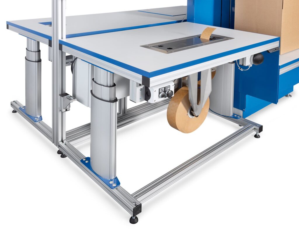 Water-activated tape is characterized by secure adhesion, tear resistance, dust resistance and recyclability. With the WAT-dispenser integrated into the table, Storopack offers an optimum solution for this sealing agent. Compared to conventional water-activated tape dispensers, which are placed on the surface of the packing table, Storopack’s solution saves space and speeds up the packing process at the same time. It also enables more ergonomic processes compared to table-top models or hand-held devices: To seal the bottom flaps of the carton using water-activated tape, it does not need to be lifted, but simply pushed over the surface of the dispenser. The device then cuts off the adhesive tape and the tail can be secured by the operator. Compared to conventional devices placed on the table, this means that employees come into much less contact with the adhesive of the tape.