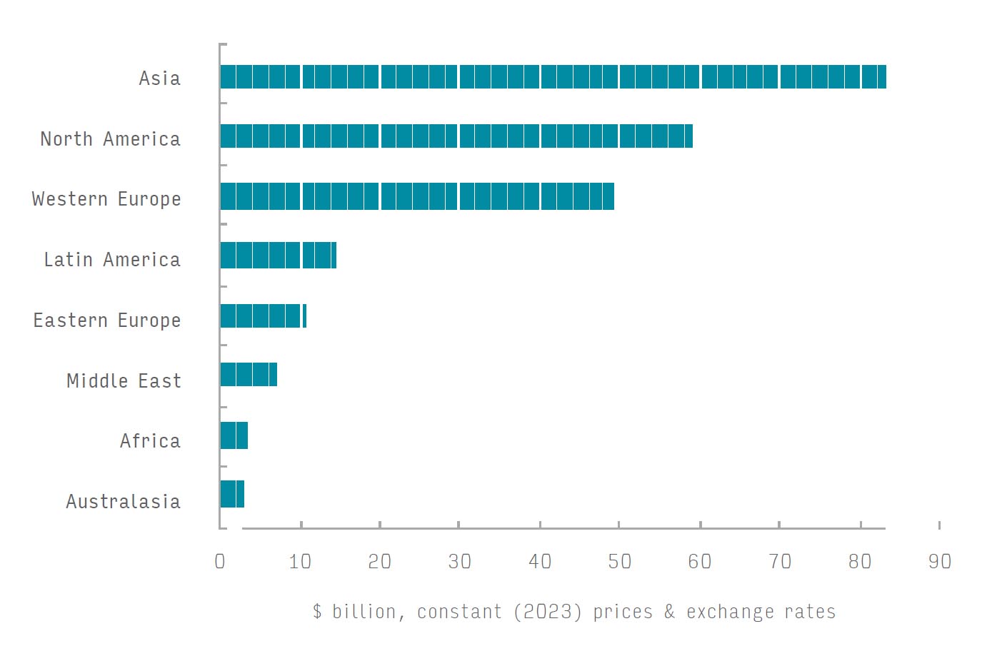 The three largest regions for flexo printing are Asia, North America and Western Europe. Combined, these account for 81.0% of global volume and 83.1% of the value in 2024. Asia is forecast to experience strong growth at a 5.8% CAGR by volume for 2024-2029, with India the fastest growing national market. North America and Western Europe are mature regions for flexo print, and will grow more moderately – 2.3% CAGR and 1.7% CAGR, respectively – across the same period.