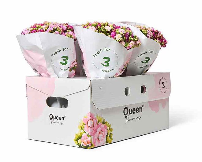 Sustainable packaging with graphics clearly communicates Queen® Flowers brand identity and the exterior surface is ideal for bold logos and creating a visual impact online, in-store, or on shelf. In addition, when the boxes are empty, they can be placed in a cardboard container for recycling.